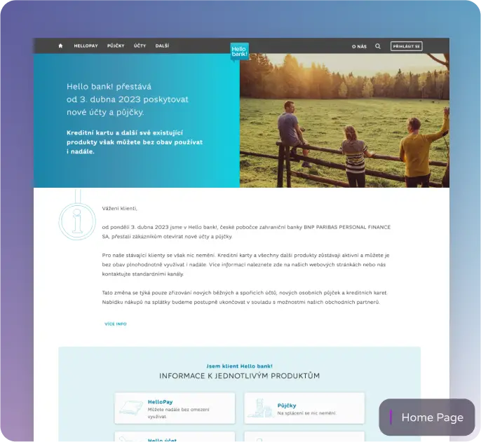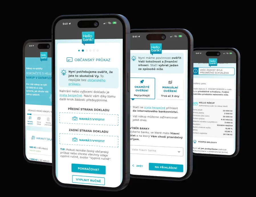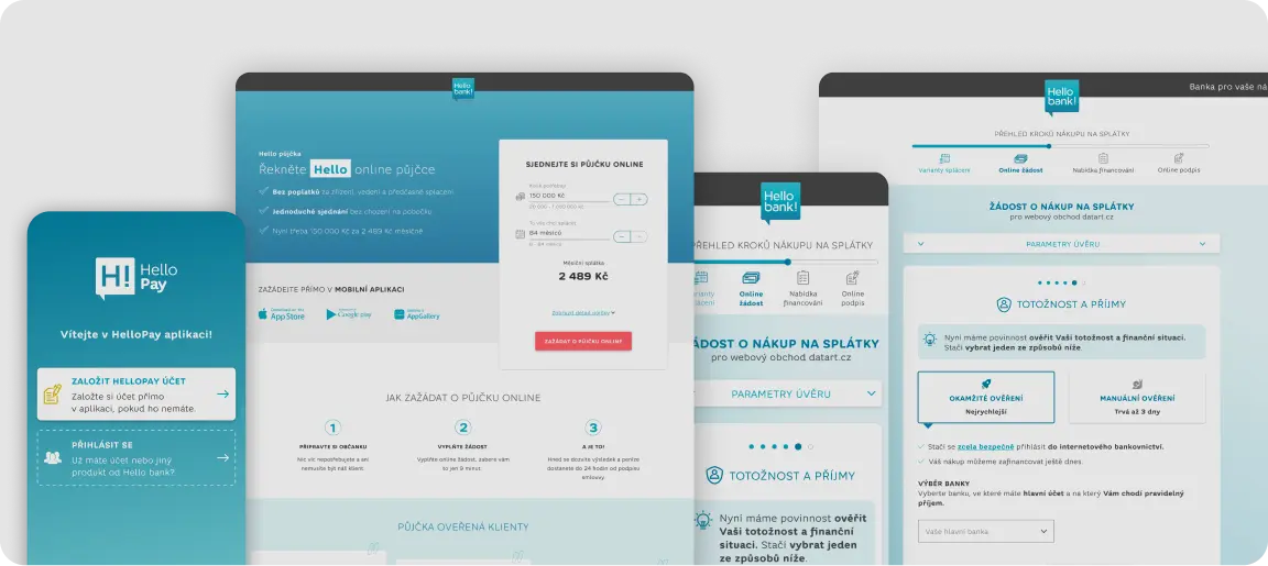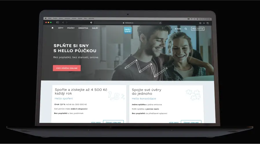 Byli jsme u samotné transformace z Cetelemu (tehdejší poskytovatel úvěrů) na Hello bank! Na začátku bylo naším úkolem postavit obsah celého webu. Kódovali jsme nové komponenty a stránky. V průběhu let jsme rozšířili svoji působnost o UX/UI design všech digitálních řešení.